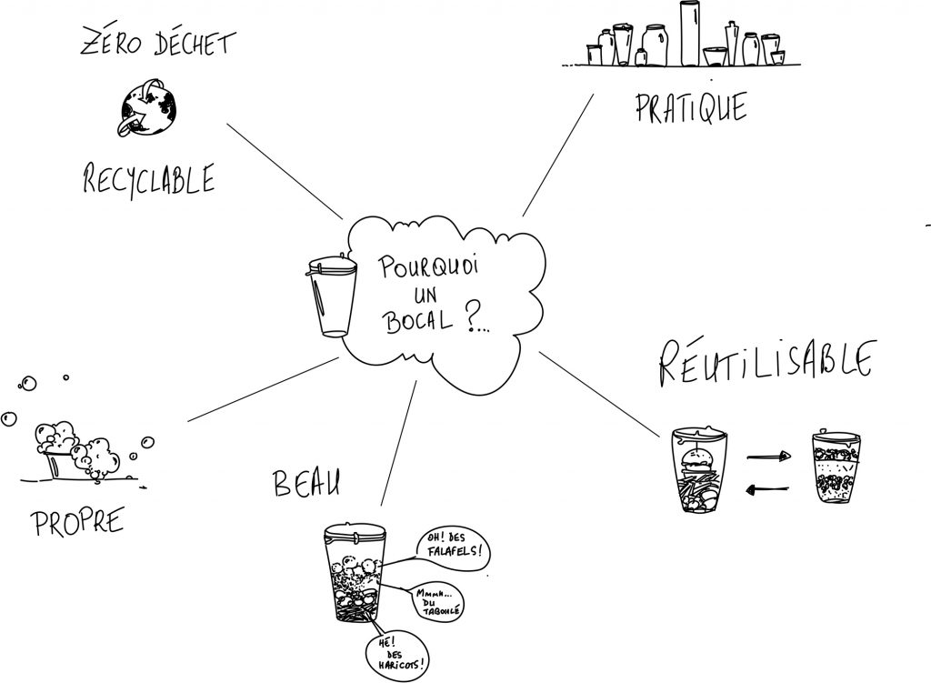 Le bocal est donc mon geste à moi pour ne pas jeter l’emballage d’un repas de midi : il est joli (on pourrait le remplir de bonbons Haribo, ma chère B. !), il est recyclable (un peu dommage, honnêtement…), il peut servir à stocker du riz, des lentilles, des pois chiches (du poulet, du saucisson, des grattons…) ; s’il est bien fermé avec son petit joint, les mites n’iront pas y pondre leurs petites larves (sauf si lesdites larves étaient déjà dans la grande boite de vrac du magasin, ah ah ah vive le bio).