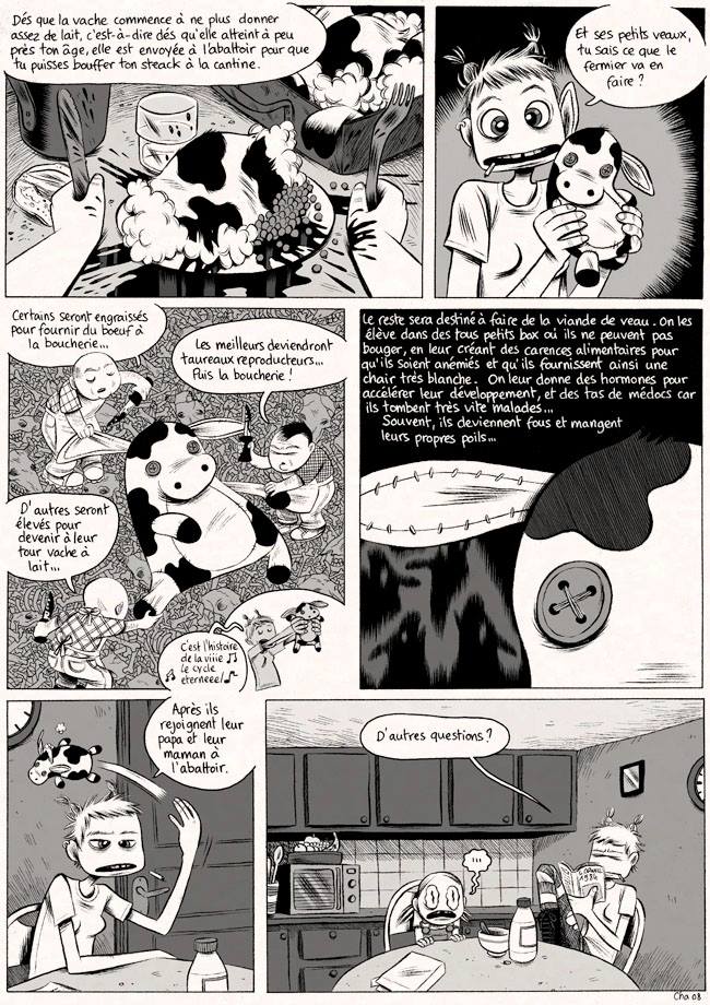 Je n’avais pas de poules (à cause du chat) mais j’allais chercher ma viande chez le boucher, mes légumes chez un producteur, et quand ma copine C., pesco-végétarienne, venait manger à la maison, elle me compliquait vraiment la vie (d’où la fameuse boite de thon dont j’ai parlé ici et qui sauve la vie quand on est face à ce fameux végétarien qui mange quand même du poisson mort). Je ne me suis jamais privée de la chambrer avec tout ça en bonne carnivore relou (qui tournait de l’oeil à la vue d’une viande rouge, à moitié crue et sanguinolente ) que j’étais.